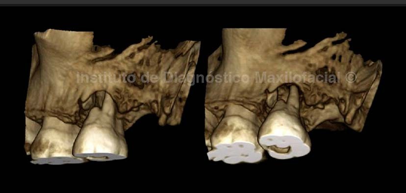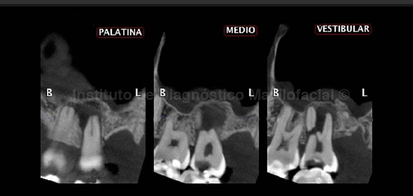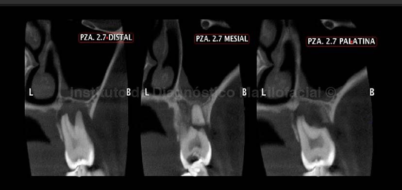 La tomografía computarizada de haz cónico (cone beam), en cortes transaxiales, tangenciales y reconstrucción 3D; nos muestra un trazo de fractura a nivel del tercio cervical de la raíz mesial de la pieza 27 (Fig 2 ,3 y 4).Así mismo observamos un proceso osteolítico perirradicular extenso que condiciona la reabsorción de las raíces distovestibular y palatina, además del engrosamiento de la mucosa sinusal, la reconstruccion 3D confirma todos estos hallazgos.(Fig.2 ,3 y 4).
