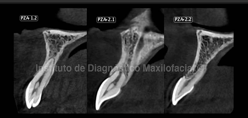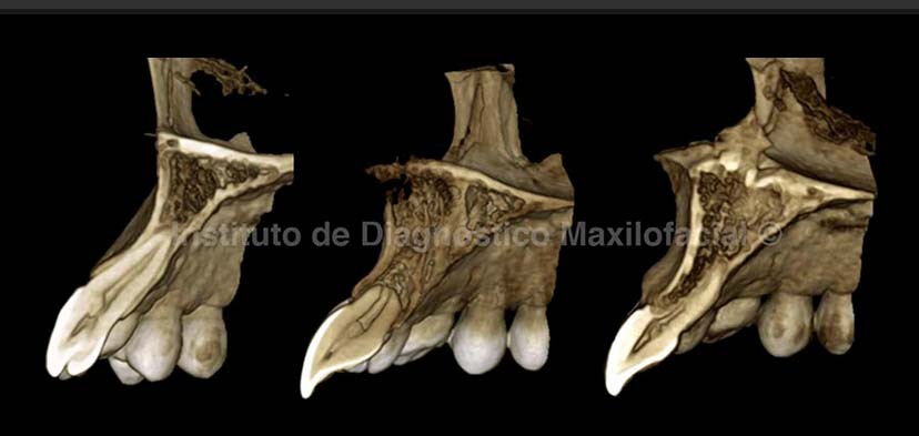 En la pieza 2.1 observamos la reabsorción radicular externa; en la pieza 2.2 observamos la marcada reabsorción de la cara vestibular de la raíz. (Fig. 3 y Fig. 4)