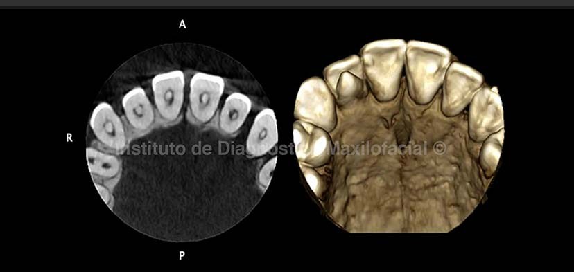 A la tomografía volumétrica confirmamos la presencia de una alteración en la morfología coronaria caracterizada por la presencia de una cúspide supernumeraria en la cara palatina de la pieza 1.2 sugerente de cúspide en talón, además de cálculos pulpares. (Fig. 2)