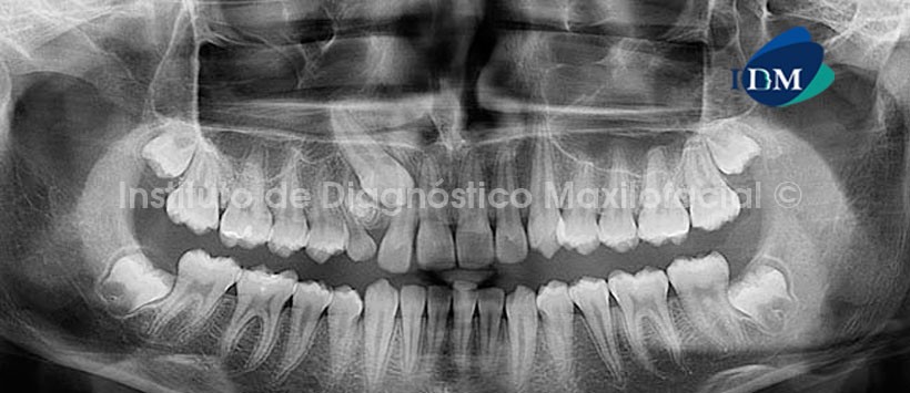 En la radiografía panorámica observamos una imagen radiopaca de densidad dentaria, con halo radiolúcido circundante, corticalizada; sugerente de lesión benigna compatible con  Odontoma Compuesto, el cual condiciona la retención y mesialización  de la pieza 1.3  produciendo la divergencia radicular de las piezas 1.2 y 5.3, la cual se encuentra en persistencia. (Fig. 1)