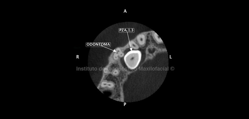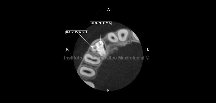 En los cortes axiales nos muestra la lesión orientada hacia vestibular y en íntima relación con la raíz de la pieza 5.3 además de la presencia de múltiples estructuras de apariencia dentaria de diversas formas y tamaño (Fig. 3), produciendo la divergencia radicular de esta. Así mismo, también presenta estrecha relación con el espacio folicular de la pieza 1.3 (Fig. 4 y 5), el cual se encuentra ligeramente aumentado de tamaño.