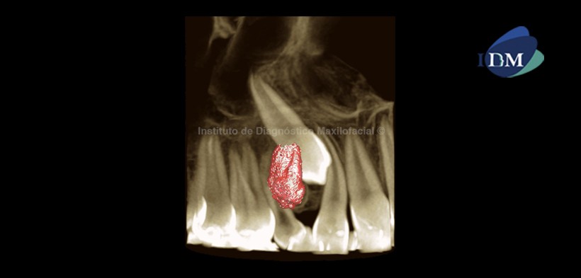 Al estudio de la  tomografía volumétrica de haz cónico (cone beam), en la vista coronal se aprecia la relación de esta lesión con la pieza 1.3, lo que condiciona el posicionamiento en vías de erupción hacia  palatino y el consecuente retraso en la reabsorción radicular de la pieza 5.3. (Fig. 2)