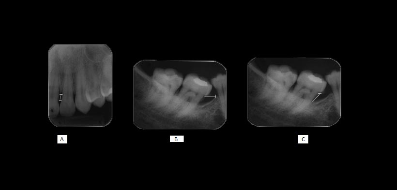 Fig 1. Radiografías periapicales que ilustran las distancias: (A) de la unión cemento-esmalte (CEJ) a la cresta alveolar (AC) en las zonas mesial de la pieza 2.2, (B) de la CEJ a la parte inferior del defecto y (C) la anchura del defecto en la superficie mesial de la pieza 4.7 (líneas blancas).