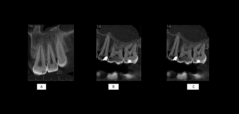 Fig 2. Imágenes de una tomografía cone beam que muestran las mediciones de las distancias: (A) de la unión cemento-esmalte (CEJ) a la cresta alveolar (AC) en la superficie mesial la pieza 2.2, (B) de la CEJ a la parte inferior del defecto y (C) la anchura del defecto en la superficie distal de la pieza 2.7 (líneas blancas).