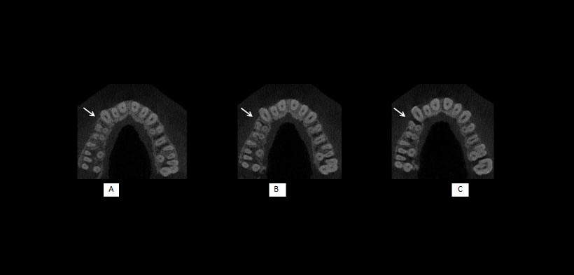 Fig 3. Cortes axiales de una tomografía que ilustran la presencia de defectos óseos combinados (flechas blancas) en la superficie mesial del diente 14. (A) No hay evidencia de defecto, (B) defecto con tres paredes restante y (C) la progresión del defecto en la dirección cervical con una pared restante.