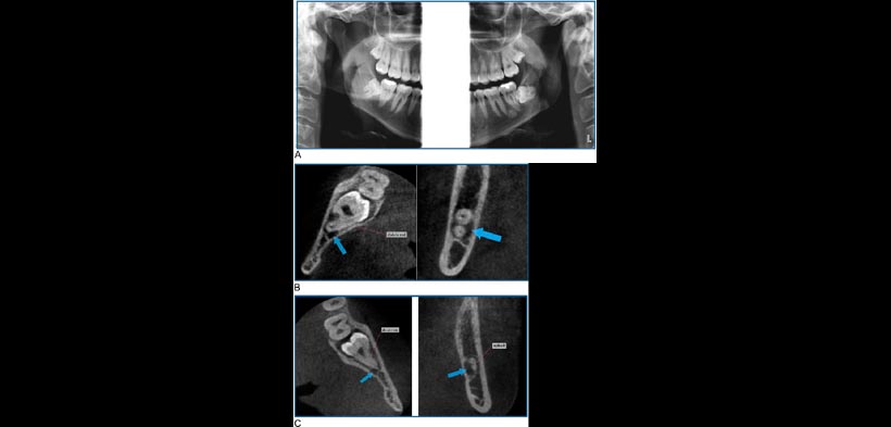 Figura 1 (A) segmentado de la imagen panorámica de las dos terceras molares inferiores. La interrupción de la cortical superior del canal mandibular está presente en ambos lados. (B) cortes axiales y coronales del tercer molar inferior derecho muestra ausencia de cortical se separación ósea entre las raíces del tercer molar y el canal mandibular. Las flechas indican el canal mandibular. (C) cortes axiales y coronales del tercer molar inferior izquierdo que muestra ausencia de cortical de separación ósea entre las raíces del tercer molar y el canal mandibular. Las flechas indican el canal mandibular.