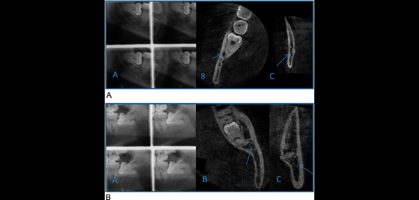 Figura 2 (A) Ejemplo de un tercer molar mandibular derecho en el cual el tratamiento se cambió de la extirpación quirúrgica a coronectomía después de las imágenes de la CBC. A) estéreo escanograma; B) CBCT vista axial; C) CBCT vista coronal. Las flechas indican el canal mandibular. (B) Ejemplo de un tercer molar inferior izquierdo en el cual el tratamiento se cambió de coronectomía a la extirpación quirúrgica después de las imágenes de la CBCT. A) estéreo escanograma; B) CBCT vista axial; C) CBCT vista coronal. Las flechas indican el canal mandibular.