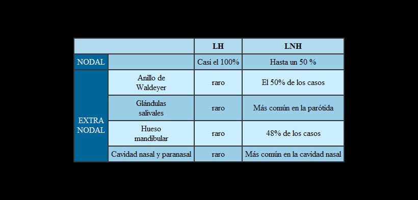 La mayoría de los LNH en la zona de cabeza y cuello son tumores malignos de los linfocitos B, y el linfoma difuso de células B es el tipo más común (40% de la NHL extra ganglionar en la cavidad bucal). La siguiente tabla presenta un resumen de la localización del linfoma en la zona de cabeza y cuello: