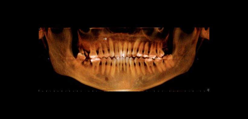 Fig. 1. Reconstrucción panorámica tridimensional de la tomografía computarizada cone beam (CBCT). Reconstrucción tridimensional panorámica que demuestra la apariencia esclerótica generalizada del maxilar superior derecho que se extiende desde el canino superior derecho a la tuberosidad. Nótese la esclerosis anterior a los dientes cariados groseramente (primero y segundo molares) y el defecto vertical en el segundo premolar. La flecha indica el ensanchamiento del espacio para el ligamento periodontal en un diente aparentemente sano (canino superior derecho).