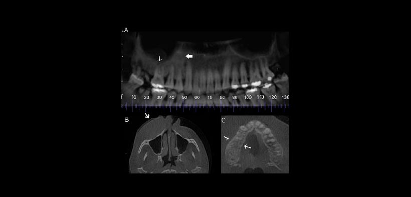 Fig. 2. CBCT reconstrucción panorámicas y vistas axiales. (a) la reconstrucción panorámica CBCT del maxilar que demuestra la ausencia de un piso sinusal bien delineada en el lado derecho (flecha delgada) vs un suelo del seno de apariencia normal bien delineada en el lado izquierdo. También es evidente el ensanchamiento del espacio del ligamento periodontal en el canino superior derecho y la extensión de la esclerosis anterior a los diente cariados (flecha gruesa). (b) vista CBCT axial que demuestra la asimetría del representante de los tejidos blandos. La flecha indica la hinchazón de los tejidos blandos. (c) CBCT vista axial que demuestra la ausencia de la expansión del maxilar derecho y la ausencia de reacción perióstica (flechas) descartando algun proceso infeccioso.