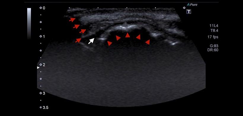 Figura 2. Imágenes de una ecografía del maxilar superior, se muestran las estructuras anatómicas normales en un paciente con pre-expansión de la sutura media palatina. Flechas superiores muestran al músculo orbicular de los labios, la flecha blanca muestra el área del vestíbulo, las flechas inferiores muestran el hueso cortical y las fronteras del maxilar superior.