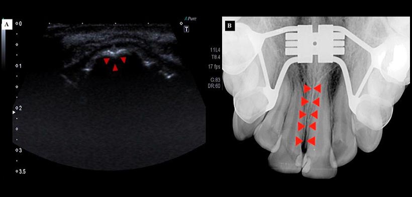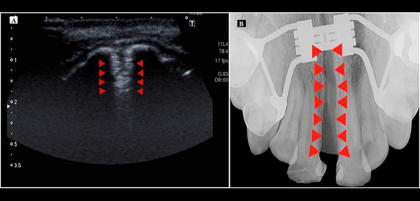 Figura 4. (A) Ecografía del maxilar superior durante la expansión, se observa la sutura palatina (puntas de las flechas). (B) Radiografía oclusal del maxilar superior, durante la expansión de la sutura palatina (puntas de las flechas).