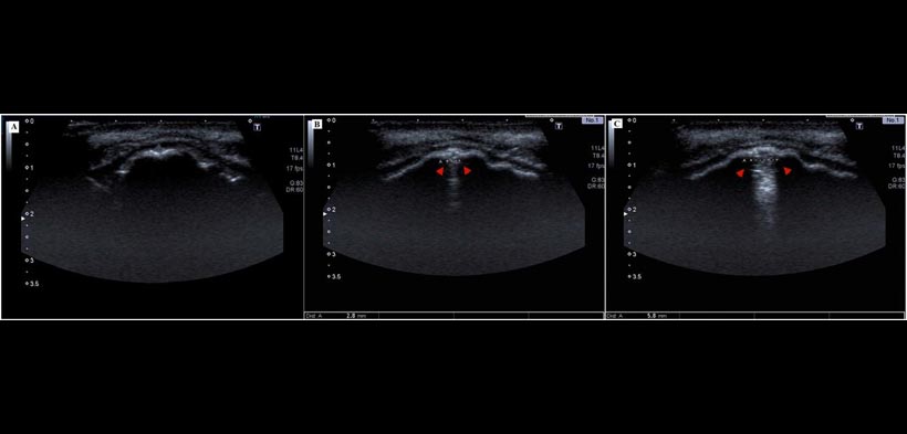 Figura 5. ETAPAS DE LA ERP, medición de la expansión de la sutura palatina en la ecografía. (A) (T0) sin expansión. (B) Expansión en estadio (T1), las puntas de las flechas muestran expansión de sutura de 2,8 mm. (C) Expansión en estadio (T2), las puntas de las flechas muestran expansión de 5,8-mm.
