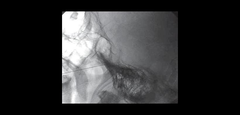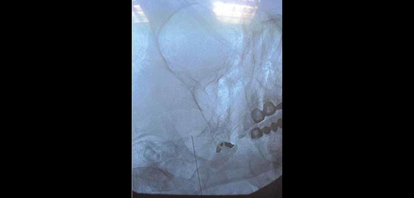 Fig. 2. Rizotomía percutánea con radiofrecuencia. Visualización del agujero oval con la utilización de un equipo de rayos en proyección anteroposterior o ligeramente caudocraneal.