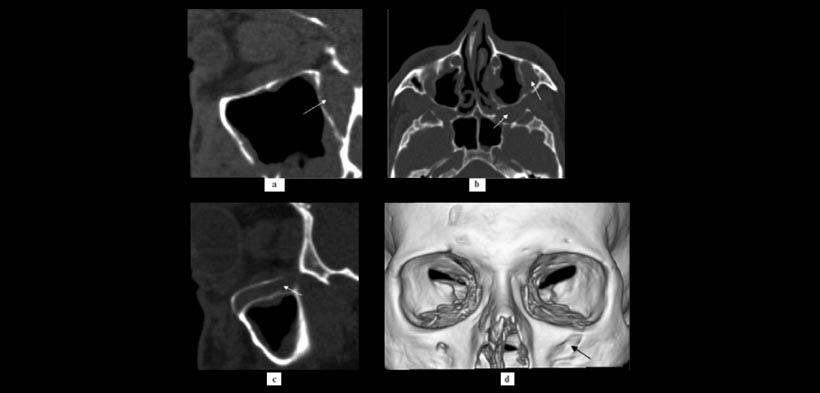 Figura 2. El remodelado óseo: TC sagital muestran efectos de la remodelación ósea en la fosa pterigopalatina (a, flecha) y el canal infraorbitario (c, flecha) de la parte izquierda. Las mismas estructuras se muestran en el plano axial (B, flechas). Reconstrucción computarizada tridimensional muestra la ampliación del foramen infraorbitario del lado izquierdo (d, flecha).