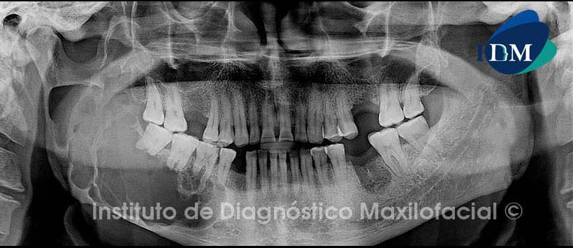 A la evaluación de la radiografía panorámica se observa imagen radiolúcida de aspecto multilocular, en cuerpo mandibular derecho que se extiende desde zona apical de pieza 45 hacia el tercio superior de rama ascendente, comprometiendo el borde anterior de la apófisis coronoides, y produce adelgazamiento de la basal mandibular y reabsorción radicular de piezas 46, 47 y 48. (Figura 1)