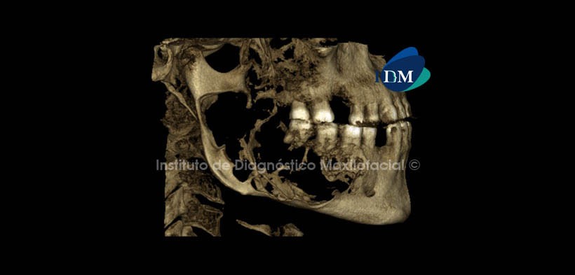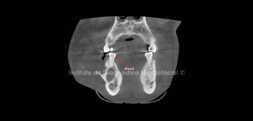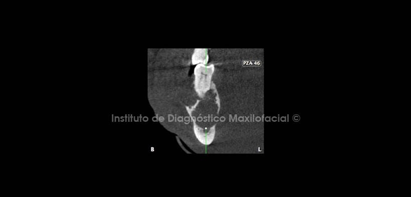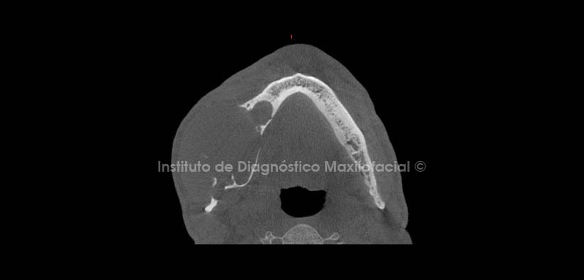 A la evaluación de la tomografía volumétrica cone beam en corte axial observamos expansión de las tablas óseas vestibular y lingual, las cuales muestran zonas de adelgazamiento y zonas de erosión de cortical. Se observa además aumento de volumen en tejidos blandos. (figura 2)