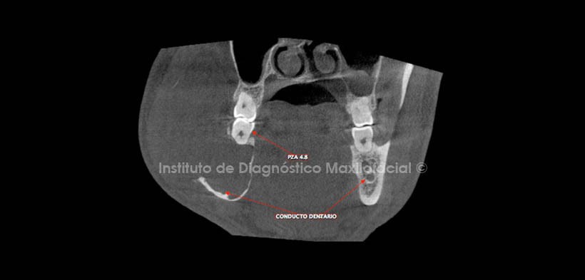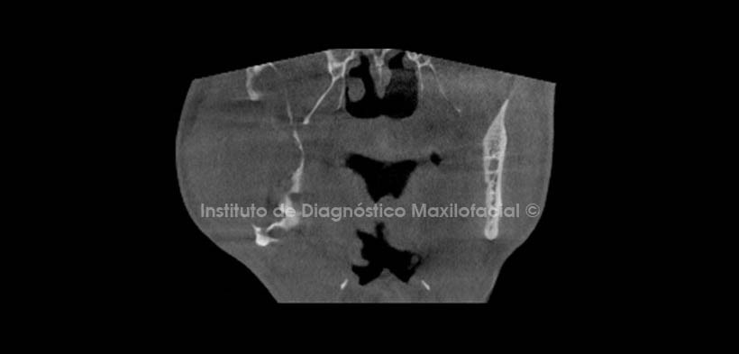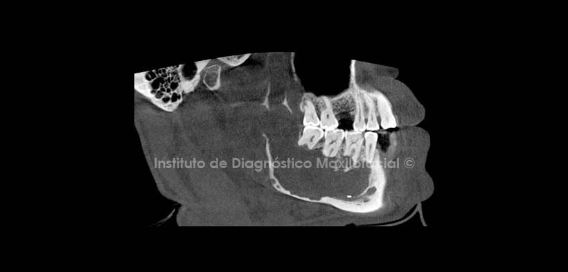 En cortes coronales apreciamos expansión de tablas a nivel de rama y cuerpo mandibular; Se observa erosión marcada en tabla ósea vestibular y desplazamiento caudal del conducto dentario inferior, el cual se encuentra sobre la basal mandibular a nivel de molares. (Fig. 3, 4 y 5)