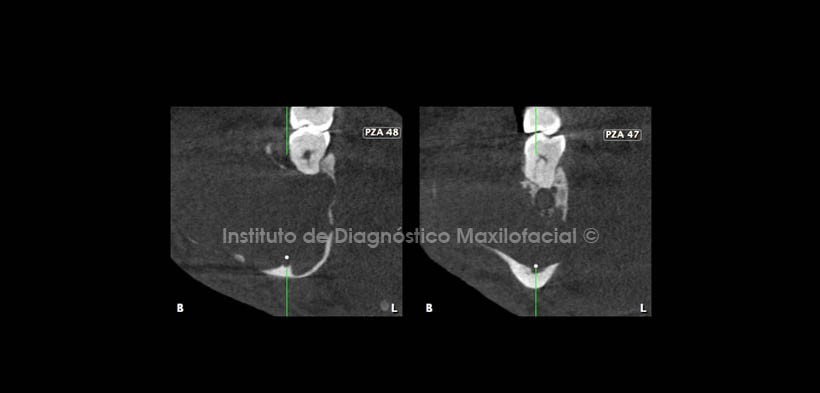 En cortes transaxiales, corte sagital y reconstrucción en 3D se aprecia claramente reabsorción radicular en piezas 48, 47 y 46 (Fig. 6-10).