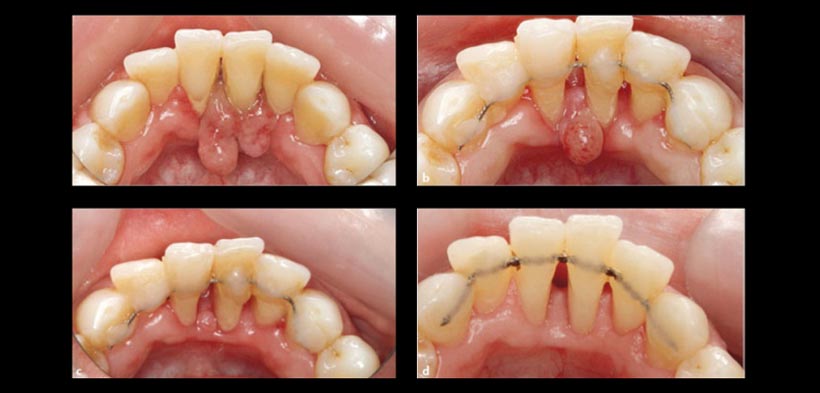 Fig. 1. Fases de tratamiento no quirúrgico de un paciente con granuloma piógeno gingival. (A) presentación inicial de la lesión (lesión en forma de coliflor exofítica en la encía lingual entre los incisivos centrales inferiores. (B) se realiza un control de placa estricto, que consiste en la eliminación de cálculo dental, se realiza instrucción de higiene bucal al paciente y un mes más tarde la lesión exofítica se reduce en tamaño. Las raíces de los dientes afectados están más expuestas a la recesión de la encía circundante, que también es menos eritematosa y edematosa. (C) se introduce la terapia medicamentosa mediante el uso de clorhexidina al 0.05 % y dos meses más tarde hay contracción sustancial de la lesión, y un eritema mínimo. (D) se sigue realizando un control estricto de placa y cuatro meses después del tratamiento la encía parece saludable.