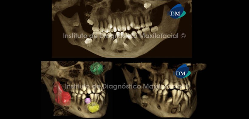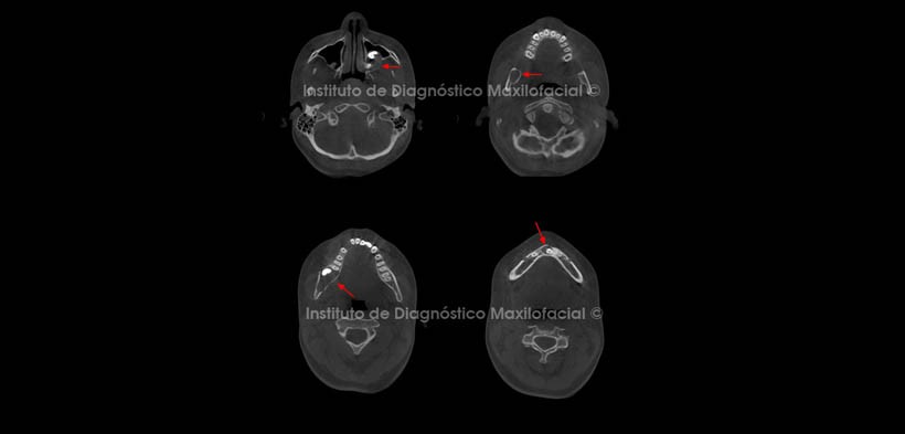 Al estudio tomográfico volumétrico (CBCT) mediante cortes axiales (Fig. 2), reformación panorámica (Fig.3) y reconstrucciones 3D (Fig. 4) apreciamos lesiones isodensas localizadas en el maxilar superior: a nivel de la corona de la pieza 2.8, la misma que se encuentra desplazada cefálicamente.