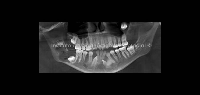En el maxilar inferior a nivel coronal de las piezas 3.2 y 4.3, que se encuentra impactada en posición mesioangular, y a nivel del cuerpo y rama mandibular del lado derecho, provocando leve expansión de la tabla ósea lingual y desplazamiento cefálico de la pieza 4.8 así como caudal con aparente impactación de la pieza 4.7.