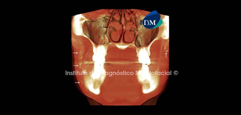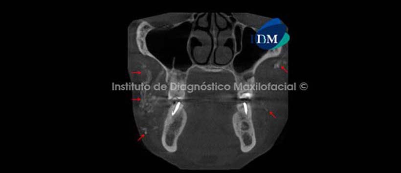 La tomografía computarizada de haz cónico en vista coronal nos muestra múltiples imágenes hiperdensas de forma irregular localizadas en la región correspondiente a los tejidos blandos de la región maxilofacial y que se encuentran con cierto predominio en el lado derecho (Fig. 1). Signos tomográficos compatibles con calcificaciones en tejidos blandos, descartar Calcinosis Cutis.