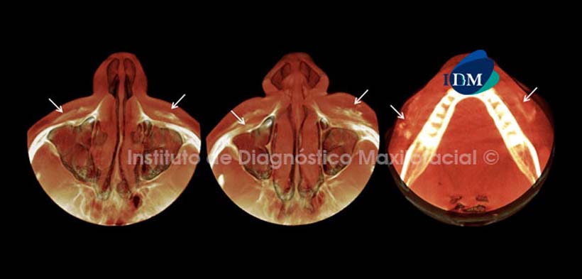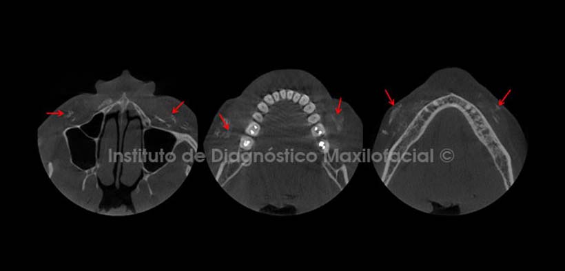 Por otro lado, las vistas axiales nos muestran la presencia de estas calcificaciones en diferentes niveles del complejo maxilofacial, observando además su cercanía a la superficie del tejido óseo en la vista más superior y a la superficie del tejido blando en la vista más inferior (Fig. 2).