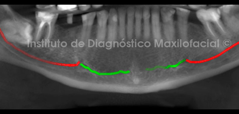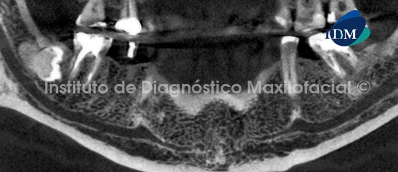 A la evaluación tomográfica se observa la proyección del conducto dentario inferior hacia la zona sinfisiaria, tal como se observa en la reconstrucción panorámica (Fig. 1), en la cual se relalizó un corte muy fino para la mejor visualización del conducto dentario inferior y del conducto incisivo mandibular.