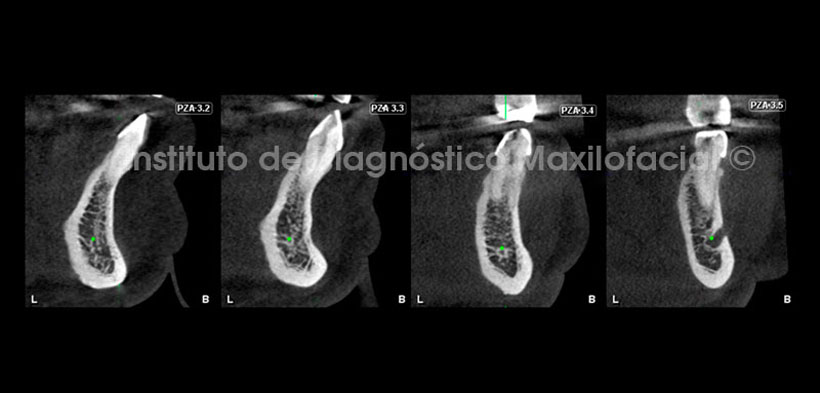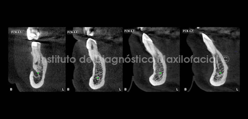 Se realizaron los cortes transaxiales (Fig. 3 y 4) para mostrar la relación del conducto incisivo mandibular con los dientes anteriores, delimitado de color verde la cortical superior de este, y así mismo se muestran el inico de este a nivel del agujero mentoniano. Obsérvese la bifurcación radicular de las piezas 3.4 y 4.4, además del proceso osteolítio a nivel apical en la pieza 4.5.