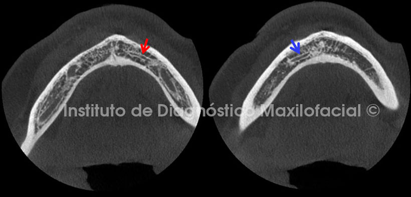 En cortes axiales (Fig.5) se aprecian ambos conductos incisivos mandibulares tanto del lado izquierdo (flecha roja) como del lado derecho (flecha azul). Dichos conductos se visualizan parcialmente en estos cortes ya que, como se observa en las imágenes anterios, esta estructura tubular presenta un trayecto irregular.