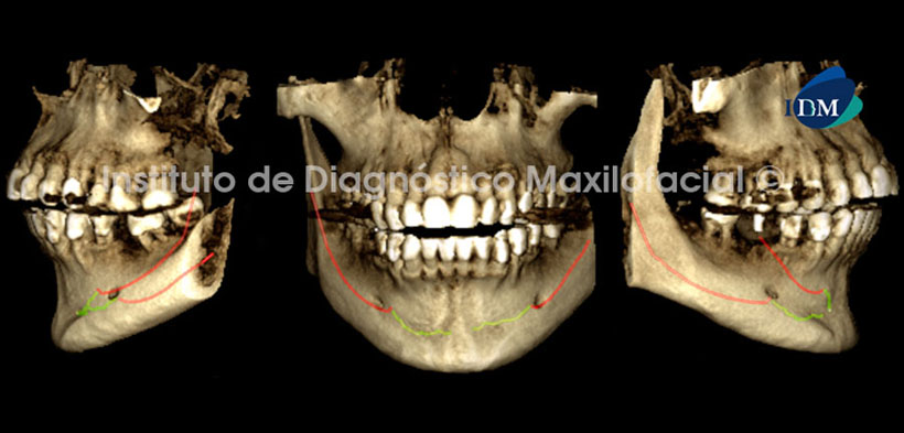 En la siguiente recontrucción panorámica se hizo un corte de mayor grosor para visualizar las piezas dentarias y la guía tomográfica. En consecuencia, se delimitaron ambos conductos mandibulares, siendo de color rojo el conducto dentario inferior y de color verde el conducto incisivo mandibular. Nótese que en ambos cortes se observa la pieza 4.8 impactada en posición horizontal y su porción radicular próxima al coducto dentario inferior.