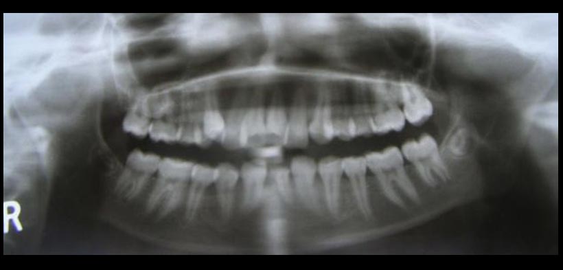 Fig. 2. La radiografía panorámica muestra la falta incisivos centrales inferiores y el incisivo lateral izquierdo.