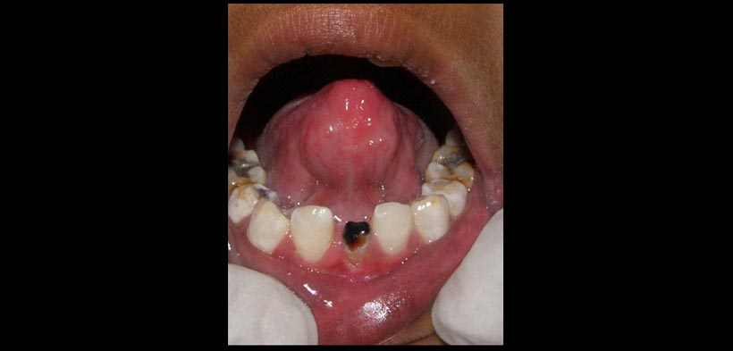Fig. 1. Anquiloglosia; fusión de la punta de la lengua con el frenillo bucal en un paciente pediátrico con oligodoncia de los incisivos anteroinferiores.