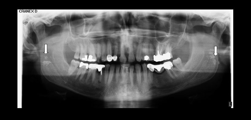 Fig. 1. Un caso de tonsilolitos bilaterales acompañado unilateral de la calcificación de la apófisis estiloides del lado derecho.