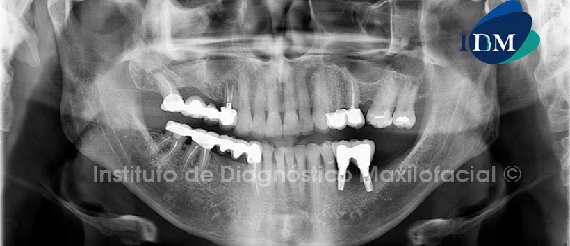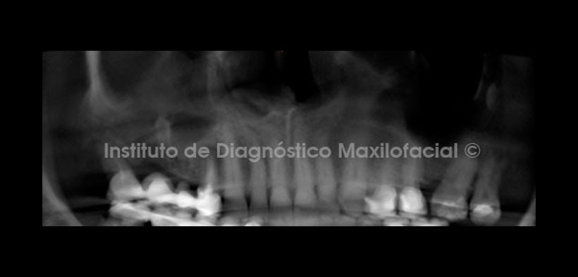 A la evaluación radiográfica panorámica (Fig.1) se observa en la unidad dentaria 1.4 material obturador de conductos, perno muñon, corona protésica (pilar de puente) se observa proceso apical, en la zona de la UD 1.6 se observa una imagen de discontinuidad en reborde alveolar, a su vez una marcada opacidad en seno maxilar del lado derecho y aparente aumento de la densidad de estructuras óseas adyacentes, se observa también una imagen radiopaca de densidad cálcica en seno maxilar de lado izquierdo sugerente a una calcificación en pared lateral externa del seno maxilar.