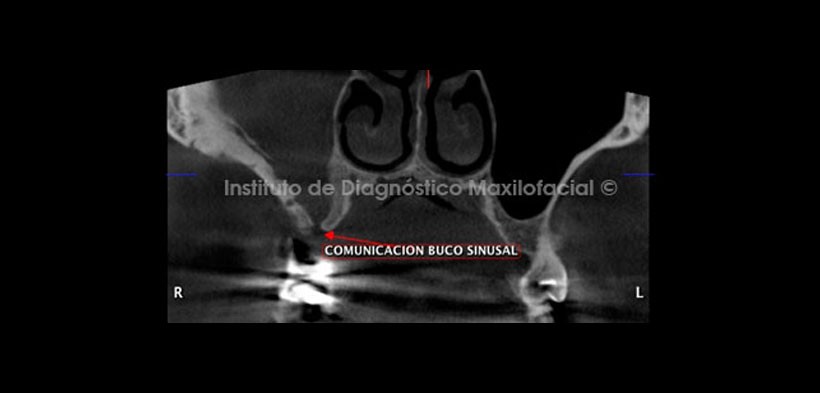 En el corte coronal se observa seno maxilar derecho ocupado y la comunicación buco sinusal a nivel del reborde alveolar en zona de pieza 1.6 (Fig. 3)