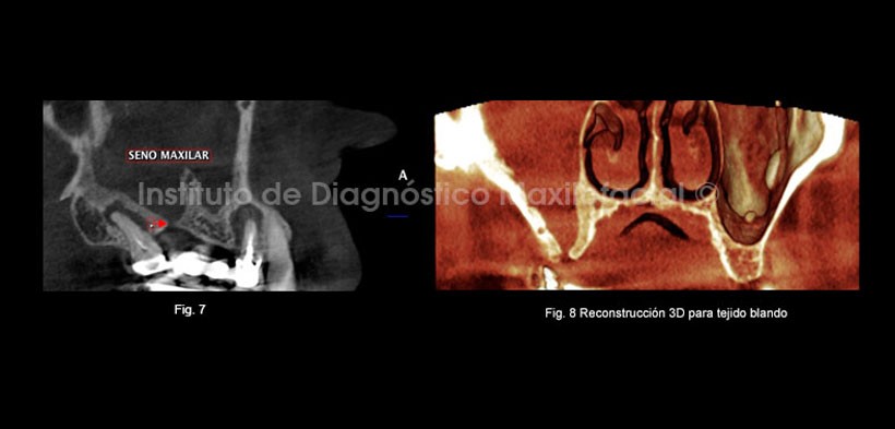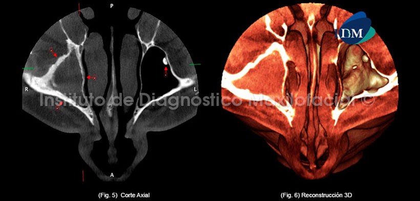 En los cortes axiales se observa el seno maxilar derecho ocupado y aumento de la densidad ósea circundante, caracterizada por el engrosamiento de las paredes del seno maxilar derecho imágenes compatibles con sinusitis maxilar crónica de origen odontogénica, además la presencia de una imagen hiperdensa en seno maxilar izquierdo compatible con Antrolito. (Fig. 5, 6, 7, 8).
