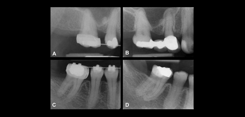 Figura 1. Radiografías periapicales de una paciente mujer que consume bifosfonatos, se muestra esclerosis ósea generalizada de espesor uniforme que implica la cresta alveolar y la lámina dura. Las figuras A y C muestran la condición previa a la terapia con bifosfonatos. Las figuras B y D muestran engrosamiento de la cresta alveolar y la lámina dura después de 2 años de terapia con bifosfonatos. No hay signos y síntomas clínicos en esta etapa inicial.