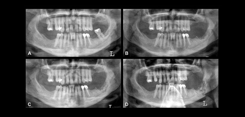 B = Radiografía panorámica después de 7 meses de una extracción dental (en el sector de la mandíbula posterior izquierdo), no se evidencian signos de reparación ósea, y se muestran alteraciones óseas escleróticas del cuerpo de la mandíbula.