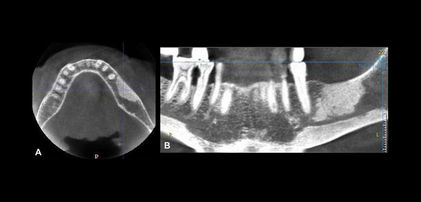 A = imágenes axiales de la mandíbula obtenido de una CBCT mostrando engrosamiento de la tabla vestibular y la región central de la densidad del hueso medular en el cuerpo mandibular izquierdo, la mucosa que recubre es clínicamente sana.