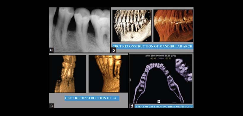 Figura 1. (a) Radiografía periapical preoperatoria mostrando al primer y segundo premolar y al primer molar inferior. (b) Reconstrucción 3D de la tomografía de haz cónico. (c) Cone beam reconstrucción tomografía computarizada de la pieza 3.4. (d) Corte axial de la tomografía computarizada de haz cónico que muestra la presencia de 3 conductos radiculares de las primeras premolares inferiores.