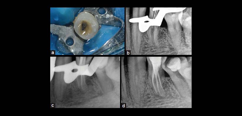 Figura 2. (a) Apertura cameral de acceso que muestra 3 orificios de los conductos radiculares (b) Radiografía que muestra la determinación de la longitud de trabajo. (c) La radiografía postoperatoria. (d) La radiografía postoperatoria.