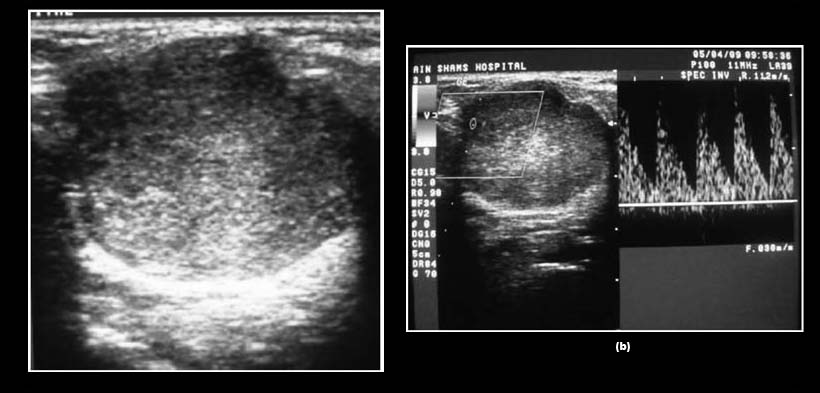 Fig. 2. (a) Ecografía en escala de grises (GSS) de una glándula parótida derecha ampliada que muestra una lesión hipoecoica bien definida, heterogénea, con múltiples áreas anecoicas y un componente sólido. (b) la ecografía Doppler a color (CDS) del mismo caso que muestra un Grado 3 vascularización dispersos, la ecografía Doppler espectral (SPD) muestra la velocidad sistólica máxima de 10,9 cm s21 (por debajo del nivel de umbral), de alto índice de resistencia de 0,89 (por encima del umbral nivel. El examen histopatológico reveló el diagnostico de carcinoma mucoepidermoide de la glándula parótida.
