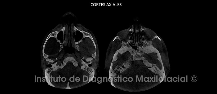 A la evaluación de la tomografía computarizada de haz cónico (CBCT), mediante reformación panorámica (Figura 1), cortes axiales (Figuras 2 y 3) y cortes coronales (Figura 4), se evidencia alteración en el patrón del trabeculado óseo que compromete huesos craneofaciales y vértebras cervicales, caracterizado por la disminución de los espacios medulares y proliferación del número de trabéculas dando un aspecto de vidrio esmerilado. Imágenes sugerentes de lesión fibroósea a descartar displasia fibrosa poliostotica.