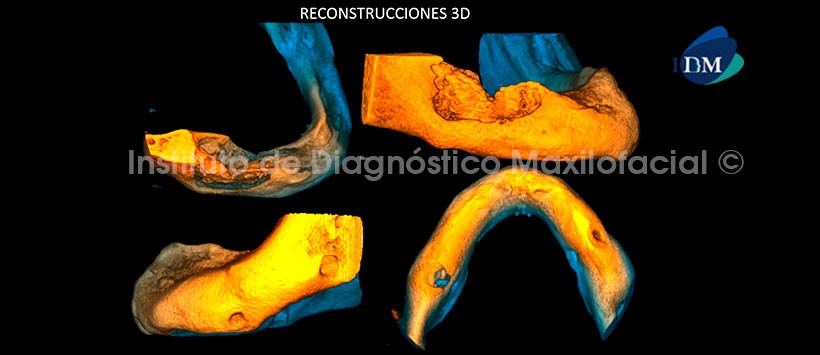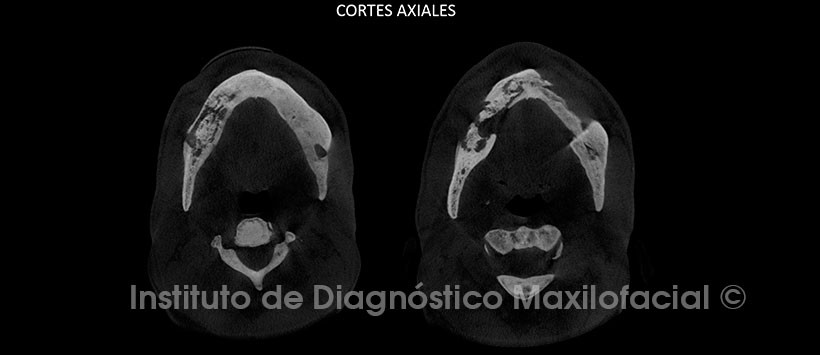 En maxilar inferior se aprecia proceso osteolítico que compromete rama, cuerpo y parasinfisis del lado derecho extendiéndose hasta la región sinfisiaria aproximadamente hasta la pza 3.1 con las siguientes características: