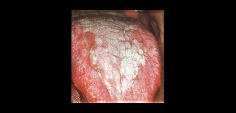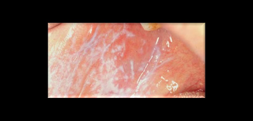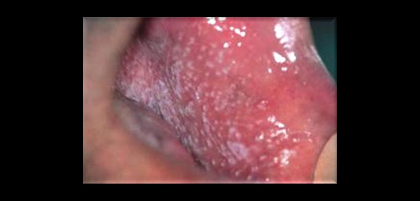 Fig. 3. Liquen plano oral: patrón en placa, lesión localizada en el dorso de la lengua, las placas no son desprendible, es de suma importancia realizar el diagnóstico diferencial con enfermedades infecciosas micóticas como la candidiasis pseudomembranosa, en la cual las placas son desprendibles.