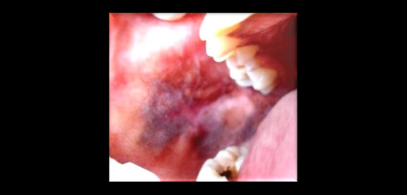 Fig. 5. Liquen plano oral: patrón buloso o ampollar, lesión localizada en la gíngiva palatina de los dientes superiores, se caracterizan por ser lesiones ampollares que posteriormente se ulceran.