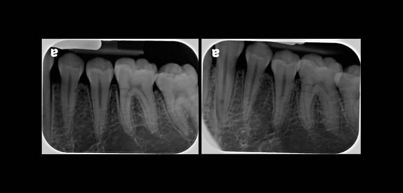 Fig. 1. Radiografía periapical digital de la pieza 3.4. Toma ortogonal (izquierda) y la correspondiente proyección mesioangulada (derecha) de la pieza 3.4 con sospecha de reabsorción radicular externa (RRE).
