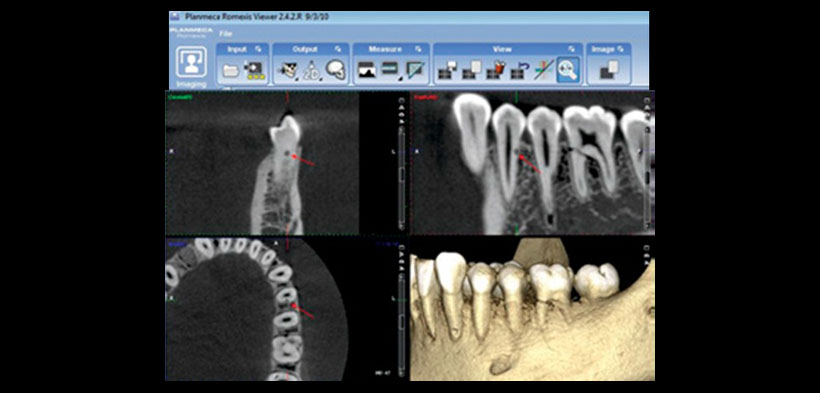 Fig. 2. Equipo Planmeca, Software Romexis Viewer. Tomografía computarizada cone beam (TCCB) muestra la vista axial, coronal, sagital, y la reconstrucción tridimensional; se logra realiza el diagnóstico de reabsorción radicular externa (RRE) en la pieza 3.4 (distal, flecha).